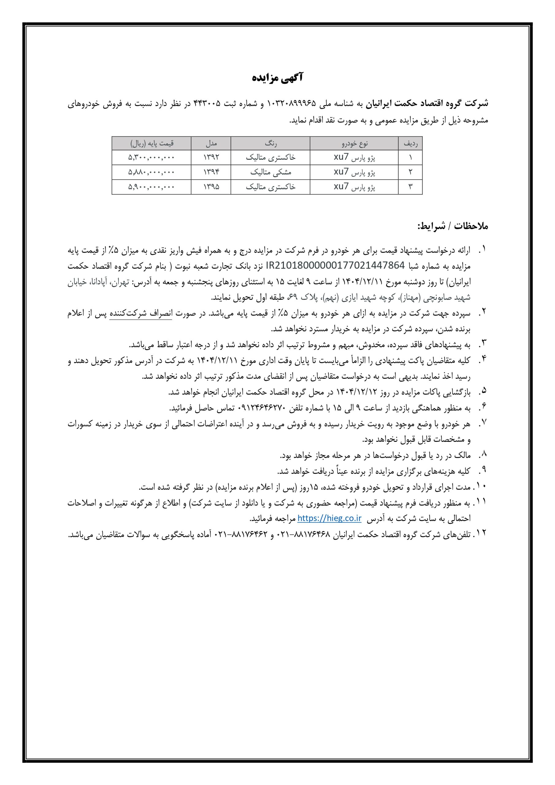 ۱۲ مهر ۱۴۰۲شرکت گروه اقتصاد حکمت ایرانیان به شناسه ملی ۱۰۳۲۰۸۹۹۹۶۵ و شماره ثبت ۴۴۳۰۰۵ در نظر دارد نسبت به فروش خودروهای پژو پارس از طریق مزایده عمومی و به صورت نقد اقدام نماید.